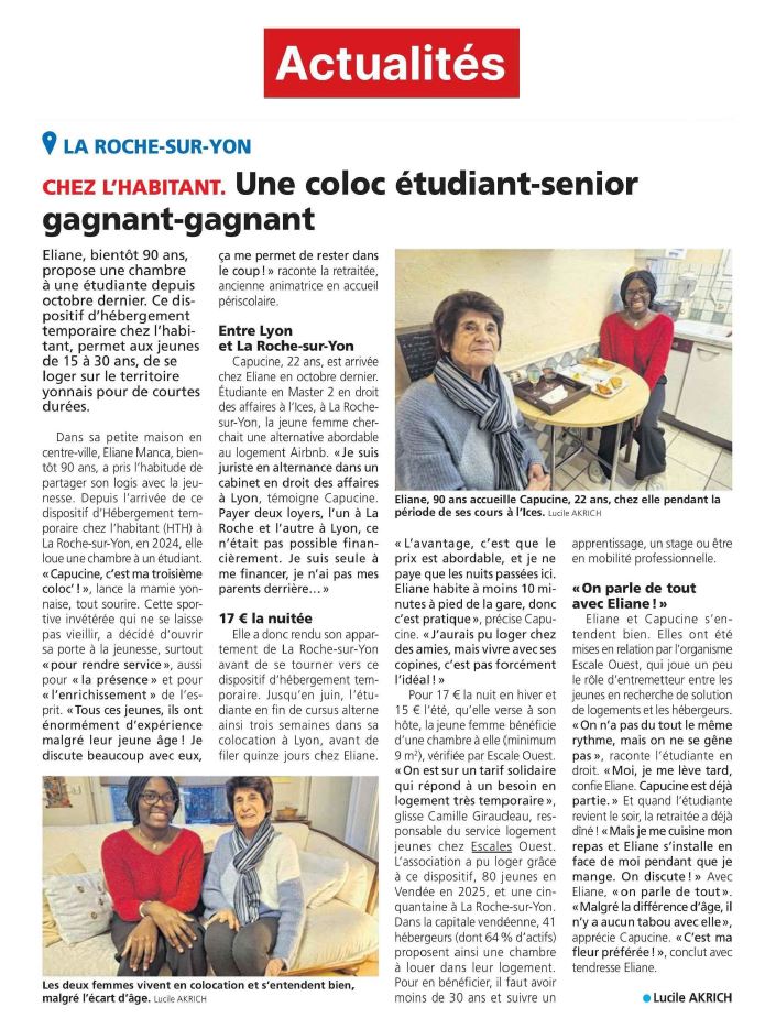 La presse en parle ! : Le dispositif HTH (Hébergement Temporaire chez l’Habitant) porté par Escalesouest séduit de plus en plus, et est une vraie solution à l’hébergement temporaire pour les jeunes en mobilité professionnelle.