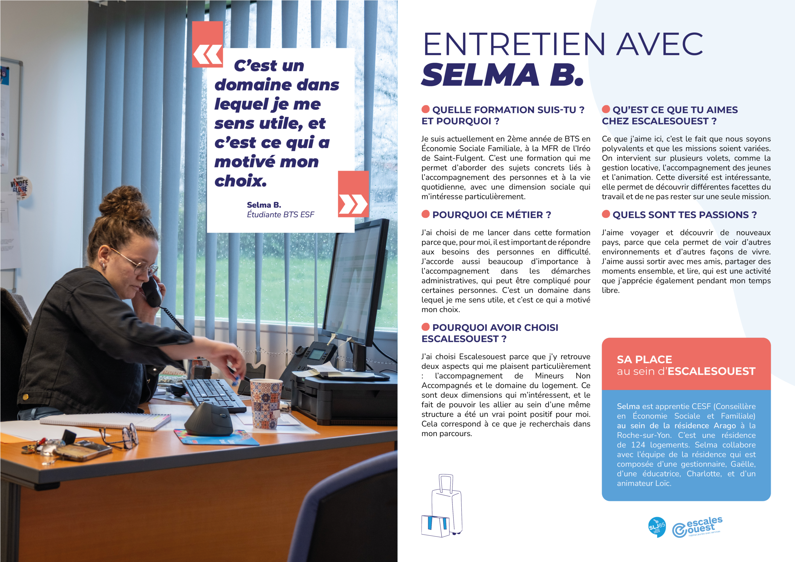 Nous vous proposons le portrait de Selma B., qui est apprentie en BTS ESF (Economie Sociale et Familiale), au sein de notre résidence Arago à la Roche sur Yon.